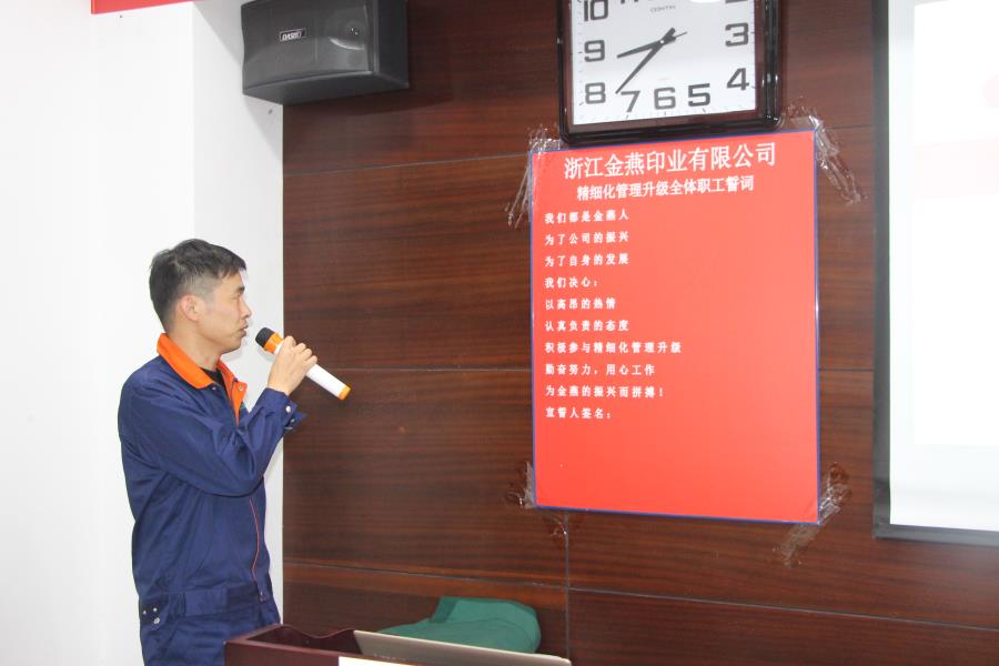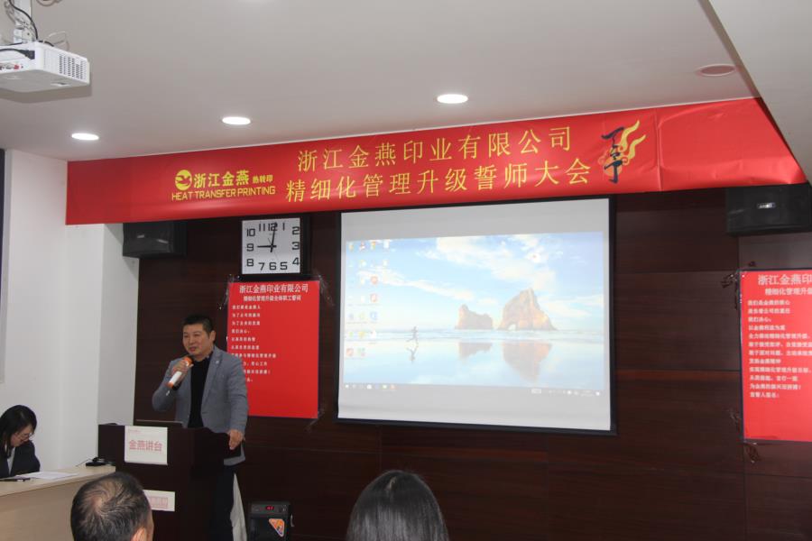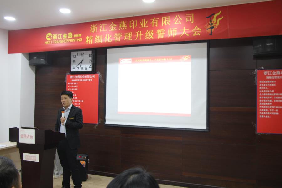 浙江金燕印业有限公司朱余品总经理进行致辞。他从现状的分析到远景的规划,总结出“逆水行舟,不进则退”。他提出:无论个人或是公司,都应该时刻前进。我们不能安于现状,提早享乐,而是应该随着“金燕”步伐一同去前进,一同成长!